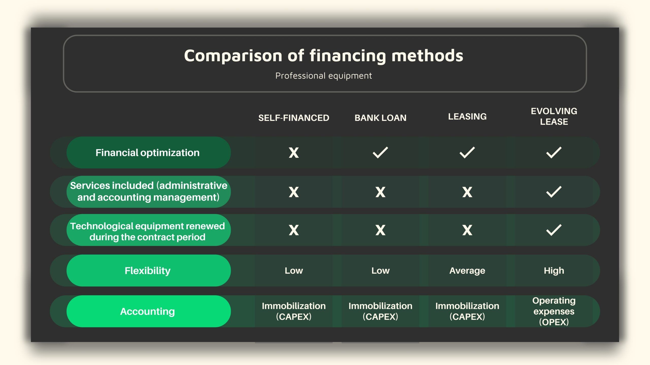 What makes financial leasing different from other financing methods (self-financing, bank loans, leasing)? Which solution is best suited to your project?